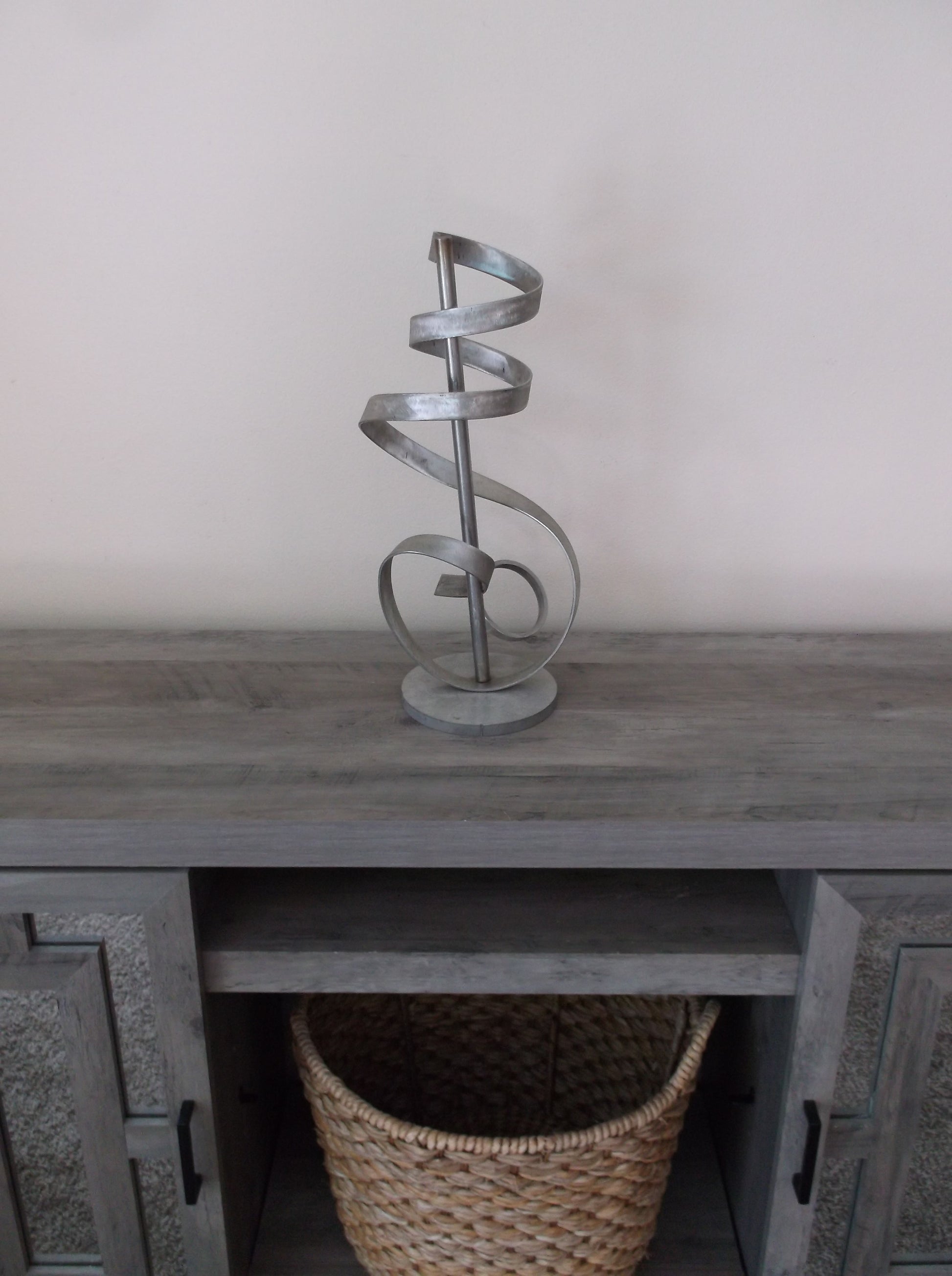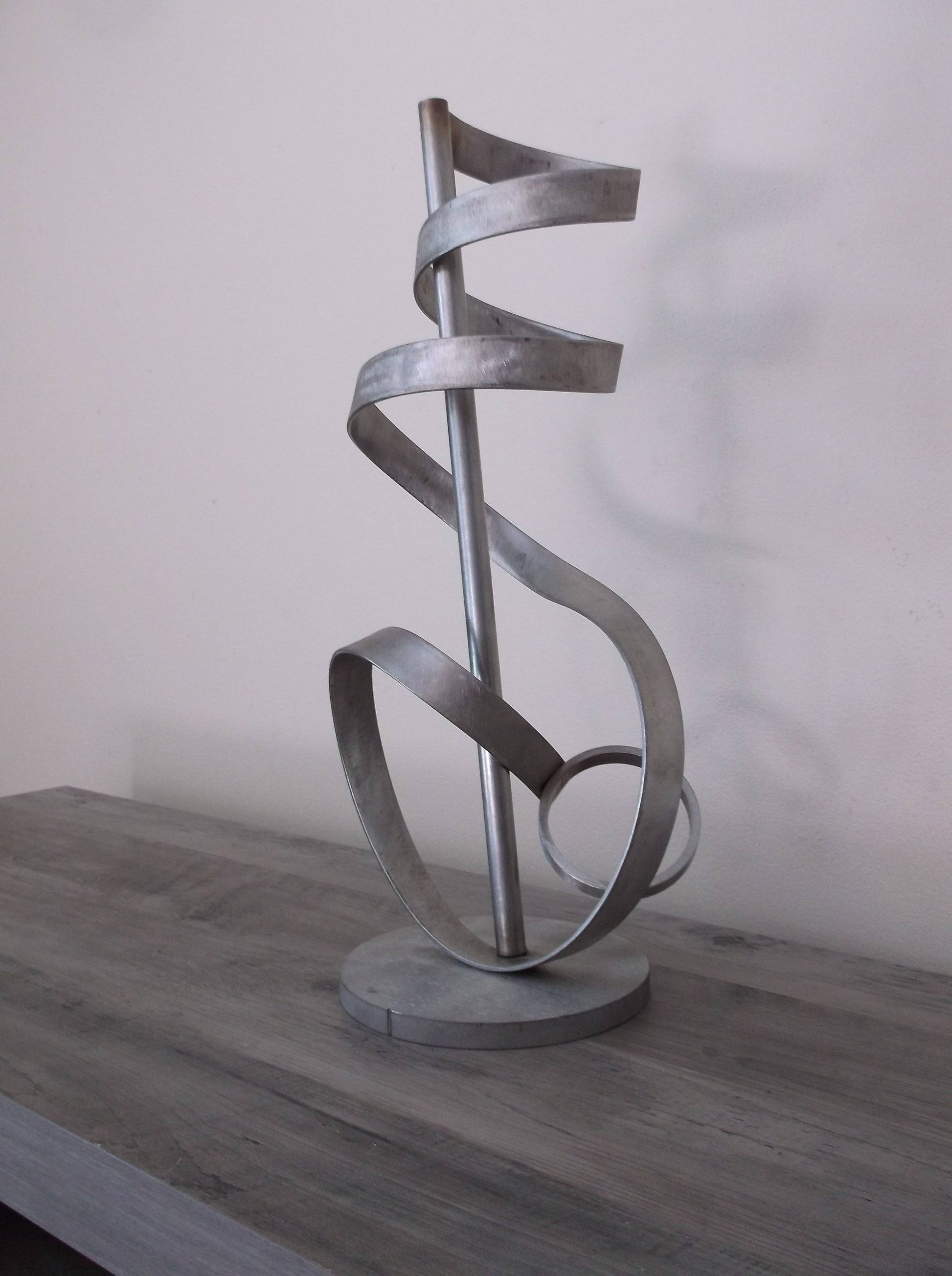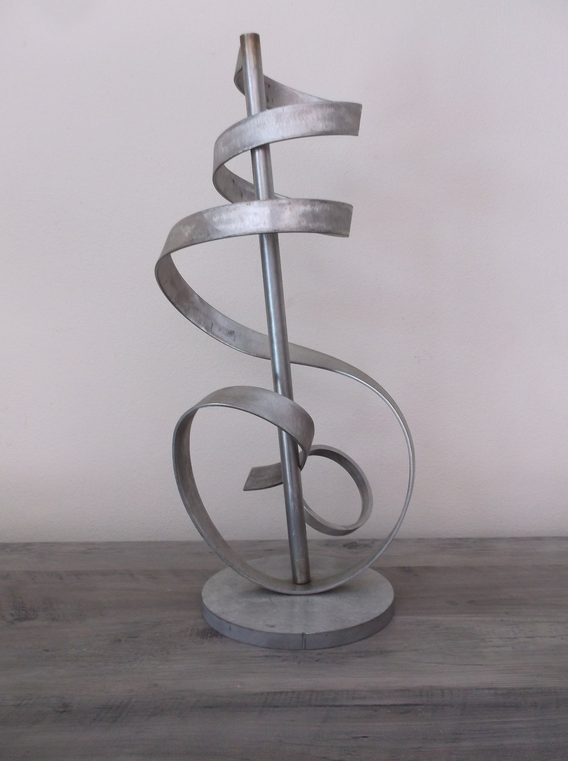 This Stainless Steel Sculpture I call "Music" it is designed for indoor or outdoor use, This grandeur of twisted Stainless Steel metal is my design, a twist of art blended into the language of music.